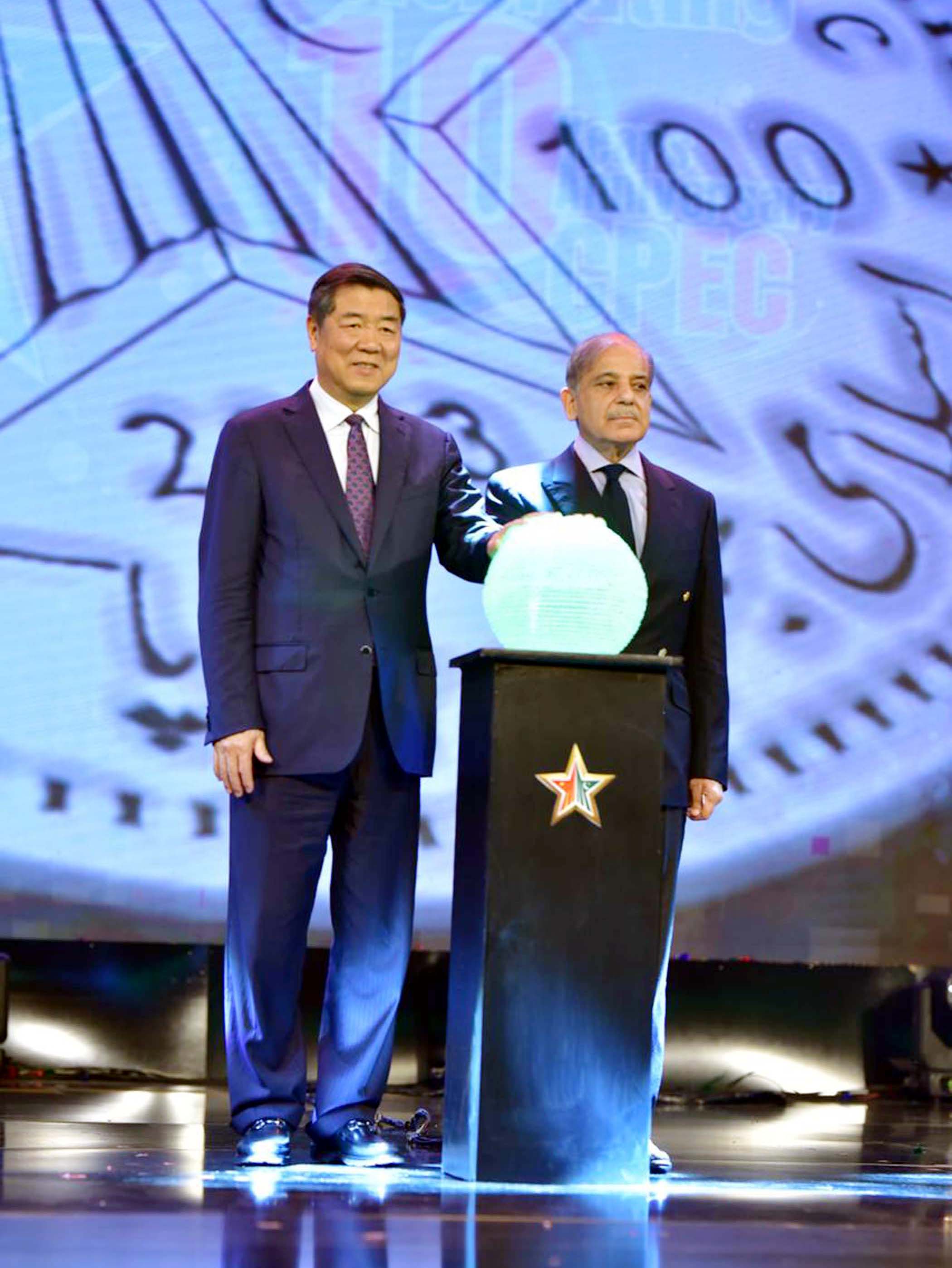 Prime Minister Muhammad Shehbaz Sharif and Vice Premier of China Mr. He Lifeng pushing a digital button to launch a commemorative coin of Rs.100